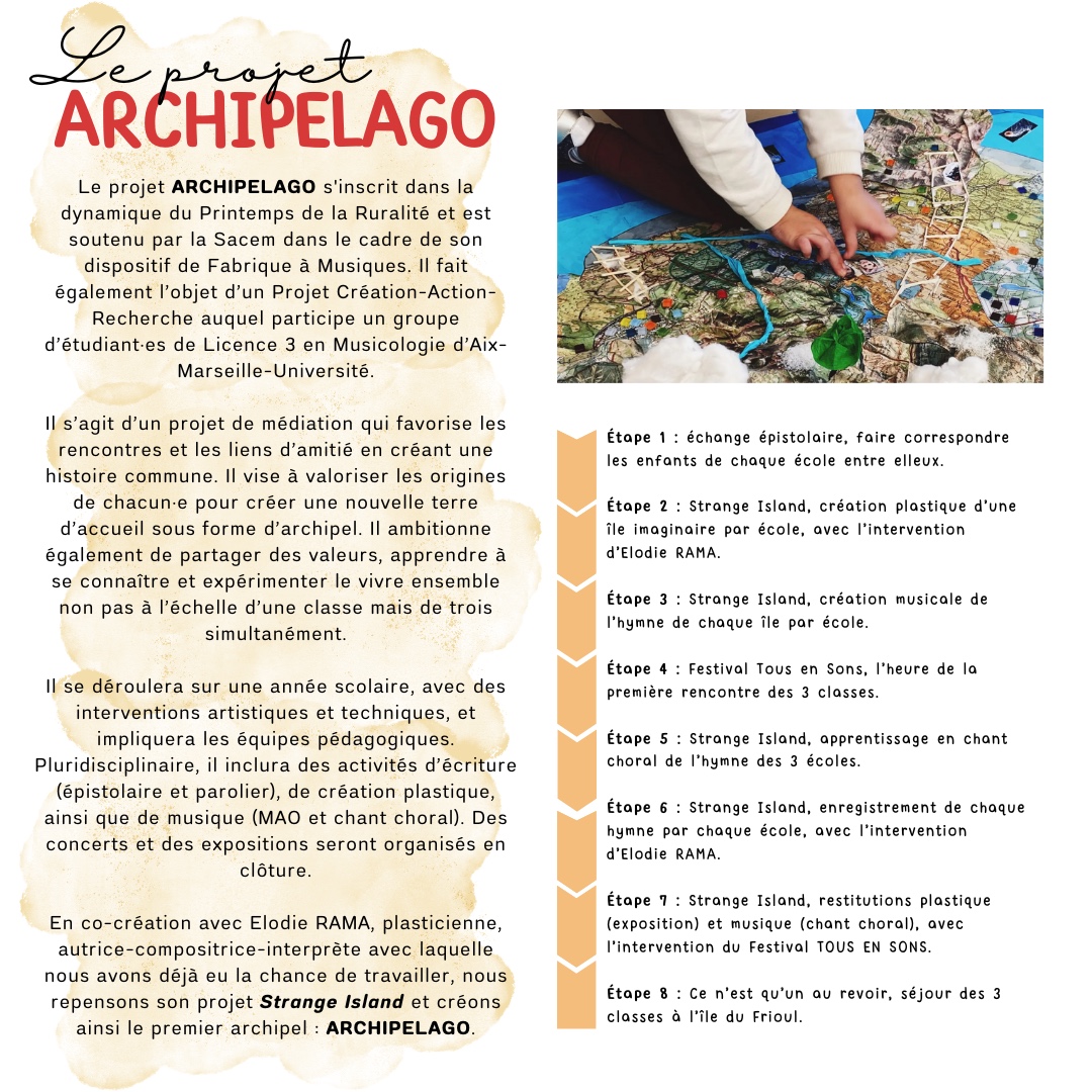 Le projet ARCHIPELAGO s’inscrit dans la dynamique du Printemps de la Ruralité et est soutenu par la Sacem dans le cadre de son dispositif de Fabrique à Musiques. Il fait également l’objet d’un Projet Création-Action-Recherche auquel participe un groupe d’étudiant-es de Licence 3 en Musicologie d’Aix-Marseille-Université.